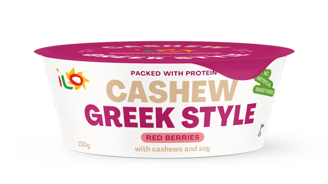 Ilo Cashew Greek Style Punaiset Marjat on kreikkalaisen jugurtin tyylinen kasvipohjainen proteiinipitoinen välipala. Makeutusaineeton.